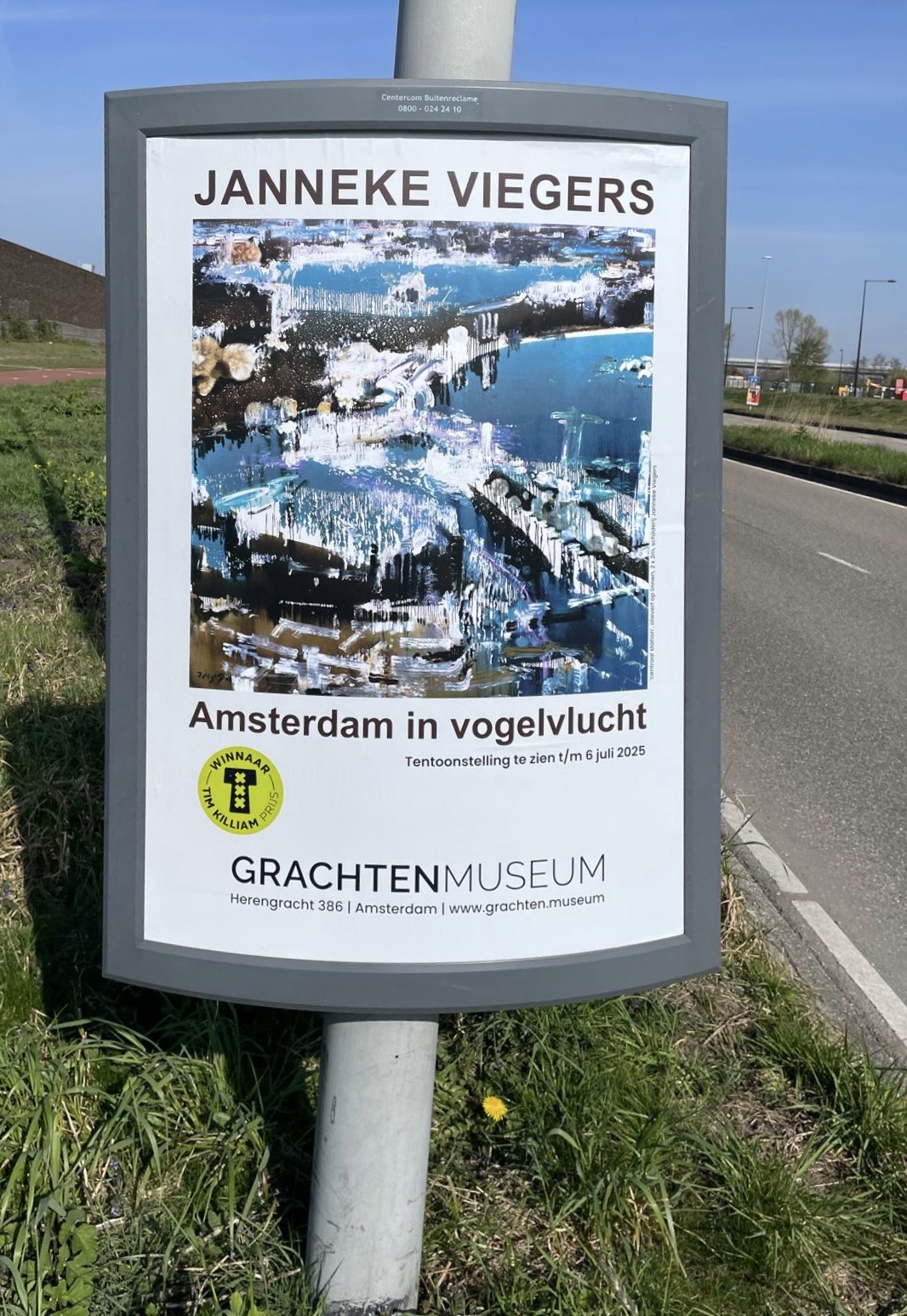 At first glance, Janneke Viegers' paintings seem abstract, large square canvases with paint that drips, circles through each other, with clashing colours, in earthy or cool tones. But then concrete objects become visible, houses, statues, streets with cars, a cluster of planes. A bird's eye view, nowadays we might rather say drone perspective, gives a completely different view of the city than the low-to-the-ground perspective of most urban illustrators and painters. Janneke Viegers does not paint her cityscapes clearly and meticulously, as painter and cartographer Cornelis Anthonisz depicted medieval Amsterdam in a bird's eye view in the middle of the 16th century. Her urban landscapes depict the chaos of the city, in which rivers, roads and buildings merge into each other. Sometimes you wonder, is everything okay down there? There is often something dark about her work. Or doom and drama reign, as in the painting of the empty Dam during corona. Viegers' paintings are more an analysis of the city's state of mind than a topographical representation. And yet we recognize Amsterdam in this mix of abstraction and figuration. Her paintings invite us to look longer, to try to figure out where we are in the city. They are full of man-made things: buildings, streets, statues, airports. Even the river Amstel has been canalized. But the city's inhabitants themselves are missing. At a time when we can zoom in on every detail with Google Maps and Google Earth, Janneke Viegers brings mystery to our image of the city. Just look, not everything is always visible. And yet, as the artist herself puts it, the bird's eye view gives a sense of context: 'the city is yours'. Janneke Viegers chose the entire city as her work area, the old city centre but also the area around the Rembrandt Tower and Schiphol. In this way, since the eighties, painting with her fingers in plastic gloves, she has built up an impressive oeuvre. For the third edition of the Tim Killiam Prize, the jury selected an artist who very idiosyncratically and consistently depicts her own city and other cities, thereby inviting us to look at our own city Amsterdam with different eyes, but also at the city as a biotope. The jury of the Tim Killiam Prize 2025 consists of: